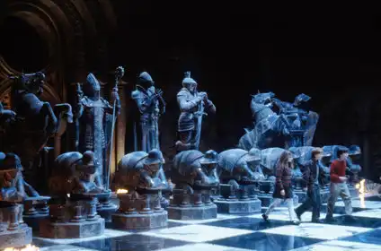 Сцены, требующие трюков и сложной постановки, часто снимались в несколько этапов. Знаменитая шахматная партия выглядела впечатляюще благодаря комбинации больших реальных фигур и тщательно спланированных трюков, где каждый удар и падение были отрепетированы до мелочей ради безопасности участников и желаемого визуального эффекта. Монтаж и работа с визуальными эффектами дополняли практическую съёмку: CGI использовали там, где механические средства были недостаточны, но всё же старались сохранить как можно больше «живых» элементов на площадке.