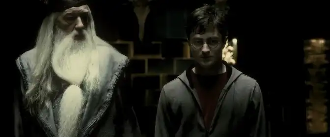 Ключевая сюжетная арка фильма — миссия Дамблдора и Гарри в поисках одного из хоркруксов. Дамблдор, подготовив Гарри к опасной экспедиции, ведёт его к удалённой пещере, где хранится предмет, являющийся одним из фрагментов души Волдеморта. Сцена в пещере — одна из самых напряжённых и визуально выразительных в фильме. Дамблдор вынужден пить жуткую зелье, которое истощает его тело и разум, в то время как Гарри смотрит на учителя в беспомощности и страхе. Режиссёр и оператор создают здесь атмосферу клаустрофобии и надвигающейся гибели: тусклые голубовато-зелёные тона, мерцающая вода, темная магия, призрачные существа — инфери, оживлённые мертвецы, охраняющие пещеру. Гарри оказывается схвачен инфери и едва спасается, когда Дамблдор, собрав последние силы, разгоняет их светлой магией. Успех миссии — добыча запечатанного медальона — кажется победой, но она даётся дорогой ценой: Дамблдор физически ослаблен, и на фоне возвращения в Хогвартс судьба школы и его собственная защита оказываются под вопросом.